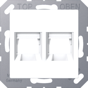 Jung inzetplaat schakelmateriaal, kunststof, wit, gebruik modular-Jack, samenstelling overig, opbouw, uitvoering oppervlakte glanzend, draagring, beschermingsgraad (IP) IP20, geschikt voor aantal connectoren 2, halogeenvrij, kwaliteitsklasse thermoplast, met stofbescherming