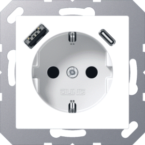 Jung wandcontactdoos (wcd schakelmat.), wit, uitvoering contactdoos CEE 7/3 (type, 2 actieve contacten (rond), 1 eenheid, 1 modules (bij modulair sys, 1 fasen, opdruk/indicatie overig, aansluitwijze steekklem, met verhoogde aanraakbeveiliging, RAL-nummer 9016