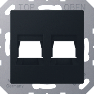 Jung A RANGE inzetplaat schakelmateriaal, kunststof, zwart, gebruik modular-Jack, samenstelling overig, opbouw, uitvoering oppervlakte mat, draagring, beschermingsgraad (IP) IP20, geschikt voor aantal connectoren 2, halogeenvrij, kwaliteit thermoplast, met stofbescherming