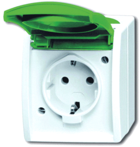 Abb Busch-Jaeger Ocean wandcontactdoos (wcd schakelmat.), groen, uitvoering contactdoos CEE 7/3 (type, aardcontact randaarde clips, 2 actieve contacten (rond), 1 eenheid, 1 modules (bij modulair sys, 1 fasen, aansluitwijze steekklem, met klapdeksel, tekstveld/beschrijvingsvlak, RAL-nummer 6018,