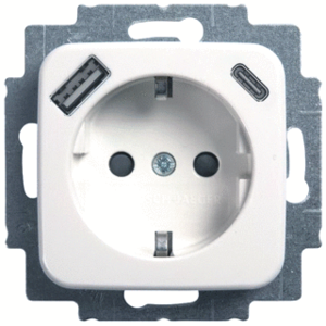 Abb Busch-Jaeger Reflex SI wandcontactdoos (wcd schakelmat.), wit, uitvoering contactdoos CEE 7/3 (type, aardcontact randaarde clips, 2 actieve contacten (rond), 1 USB-A-poorten, 1 USB-C poorten, maximale stroomsterkte van USB-voed 2.4A, 1 eenheid, 1 fasen, aansluitwijze steekklem, RAL-nummer 9010,