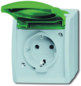Abb Busch-Jaeger Ocean wandcontactdoos (wcd schakelmat.), groen, uitvoering contactdoos CEE 7/3 (type, aardcontact randaarde clips, 2 actieve contacten (rond), 1 eenheid, 1 modules (bij modulair sys, 1 fasen, aansluitwijze steekklem, met klapdeksel, tekstveld/beschrijvingsvlak, RAL-nummer 6018,