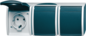 Abb Busch-Jaeger Ocean wandcontactdoos (wcd schakelmat.), blauw, uitvoering contactdoos CEE 7/3 (type, aardcontact randaarde clips, 6 actieve contacten (rond), 3 eenheden, 1 modules (bij modulair sys, 1 fasen, aansluitwijze schroefklem, met klapdeksel, RAL-nummer 7035, geïsoleerde montage