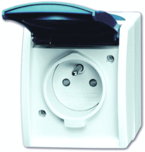 Abb Busch-Jaeger Ocean wandcontactdoos (wcd schakelmat.), blauw, uitvoering aardingspen, aardcontact rond, 2 actieve contacten (rond), 1 eenheid, 1 modules (bij modulair sys, 1 fasen, aansluitwijze schroefklem, met klapdeksel, met verhoogde aanraakbeveiliging, RAL-nummer 7035, geïsoleerde montage