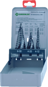 Greenlee trappenboor, boordiameter 4 - 30mm, grootheid mm, met ontbramer, max. plaatdikte 3.5mm, 31 boortrappen, 3 boren, 1 snijmessen, 9 trappen boor 1, 9 trappen boor 2, 13 trappen boor 3, boordiameter boor 1 4 - 12mm, boordiameter boor 2 4 - 20mm, boordiameter boor 3 6 - 30mm,