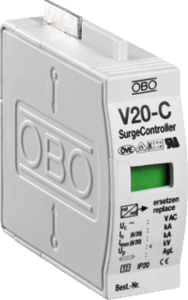 Obo V20 280 netoverspanningsbeveiliging, grijs, uitvoering polen 1, beveiligingsklasse 2(c), netvorm TN, op basiselement, uitvoering stekerdeel, nom. spanning 280V, max. continuspanning AC 280V, beschermingsgraad (IP) IP20, DIN-grootte 1 TE (Rastermaat), max. aderdoorsnede soepel 25mm²,