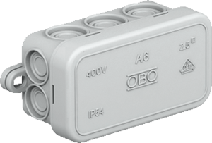 Obo A opbouwdoos wand/plafond montagedoos, kunststof, grijs, (lxbxd) 80x43x36mm, vierkant, wand-/plafondmontage, max. aderdoorsnede 2.5mm², nom. isolatiespanning Ui 690V, voor buisdiameter overig, type behuizingsdoorvoer uitbreekpoort, 10 invoeren, oppervlaktebescherming geen (onbehandeld),