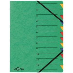 PAGNA sorteermap. Capaciteit: 450. Diepte: 5 mm. Formaat: A4. Hoogte: 320 mm. Ruimte voor etiketten: nee. Fabrikant nr.: 24131-03. Materiaal: karton. Modelnummer: 24131-03. Aantal vakken: 12. Opening: rechts. Verzegeling: rubbere band. Grootte: A4. Geschikt voor: ordenen van documenten. Verticaal of Diagonaal: staand. Gewicht: 290 g. Breedte: 240 mm. Beschrijfbaar: ja. Kleur: groen.