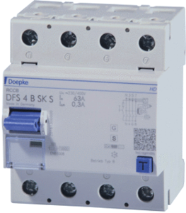 Doepke aardlekschakelaar, 4 polen, type lekstroom B, selectieve bescherming, DIN-rail, nom. (meet)stroom 63A, nom. foutstroom 0.3A, aansluitbare geleiderdoorsnede eend 1.5 - 50mm², nevenapparaat mogelijk, kortsluitvastheid (Icw) 10kA, frequentie 50Hz, beschermingsgraad (IP) IP20,