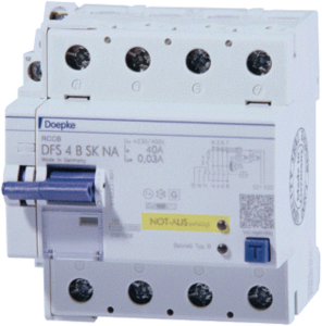 Doepke aardlekschakelaar met nevenapparaat, 4 polen, nom. (meet)spanning 400V, nom. (meet)stroom 63A, nom. foutstroom 30mA, DIN-rail, type lekstroom B, kortstondigvertraagd type, kortsluitvastheid (Icw) 10kA, nom. afschakelvermogen 0.63kA, stootstroomvastheid 3kA, frequentie 50Hz,
