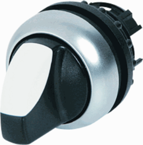 Eaton Industries RMQ-Titan keuzeschakelaar frontelement, uitvoering van het bedieningselemen draaigreep, geschikt voor verlichting, schakelfunctie vergrendelend, frontrand titanium, bedieningselement zwart, 2 schakelstanden, gatdiameter 22.5mm, bouwvorm lens rond, signaallampkapje wit,