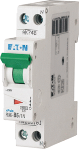 Eaton Industries PLN 6 installatieautomaat, inbouwdiepte 70.5mm, uitschakelkarakteristiek B, 2 polen (totaal), 1 beveiligde polen, nom. (meet)stroom 6A, nom. (meet)spanning 230V, spanningstype AC, nom. isolatiespanning Ui 440V, nom. stoothoudspanning (Uimp) 4kV,