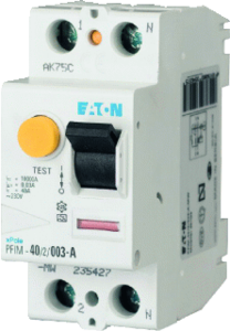Eaton Industries P FIM aardlekschakelaar 1, 2 polen, nom. (meet)spanning 230V, nom. (meet)stroom 40A, nom. foutstroom 0.03A, nom. isolatiespanning Ui 440V, nom. stoothoudspanning (Uimp) 4kV, DIN-rail, type lekstroom A, kortsluitvastheid (Icw) 10kA, stootspanningsvastheid 0.25kA, spanningstype AC,