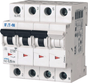 Eaton Industries FAZ C installatieautomaat, inbouwdiepte 70.5mm, uitschakelkarakteristiek C, 4 polen (totaal), 3 beveiligde polen, nom. (meet)stroom 40A, nom. (meet)spanning 400V, spanningstype AC, nom. isolatiespanning Ui 440V, nom. stoothoudspanning (Uimp) 4kV,