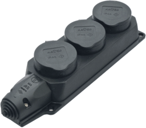 Kalthoff contactdooscombinatie, kunststof, zwart, 3 randaarde-contactdozen, met deksel, behuizingsvorm rechthoekig, stekerstand gedraaid, beschermingsgraad (IP) IP44, uitvoering oppervlakte mat, hoek stekerstand 45°, oppervlaktebescherming geen (onbehandeld), met ophangbeugel, 3 eenheden,