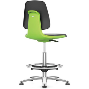 Werkplaatsstoel Labsit op glijders, met voetensteun_Bimos, Type voet: Stoeldoppen, Zitting materiaal: Imitatieleer, Stoel model: Hoog, Voetensteun: ja, Min. zithoogte: 520 mm, Max. zithoogte: 770 mm, Kleur: Groen, Zitbreedte: 460 mm, Zitdiepte: 42 cm, Rughoogte: 420 mm, Gewicht: 11.5 kg, Recyclebare verpakking: Ja - 100%, Gerecyclede verpakkingen: 80 %, Gerecycled product: 54 %, Eco-verantwoordelijke aanpak: ja