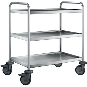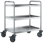 • Serveerwagen van roestvrij staal met kunststof wielen 4 zwenkwielen ø125 mm waarvan 2 met rem Afmetingen van de plateaus: 3 plateaus 800 x 500 mm max