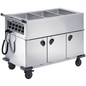 Voedselverdeelwagen van roestvrij staal 3 individuele bakken voor 3x GN 1/1-200 of onderverdelingen daarvan compartimenten: 3 compartimenten, verwarmd, met elk 6 paar geleiders voor GN 1/1, afstand: 57,5 mm Bakken en compartimenten apart te regelen en verwarmen, 4 wielen ø125 mm, 2 bokwielen, 2 zwenkwielen met rem Werkhoogte: 900 mm