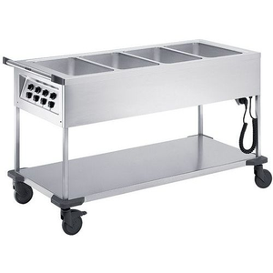 Voedselverdeelwagen van roestvrij staal 4 individuele bakken met thermostaat, nat en droog te verwarmen, 4 zwenkwielen ø125 mm waarvan 2 met rem Capaciteit: 4x GN 1/1-200 of onderverdelingen daarvan bakken apart te regelen en verwarmen Werkhoogte: 900 mm
