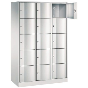 Garderobekast met 9 en 15 vakken vandalismebestendige deur, Type garderobekast: Met vakken, Materiaal: Staal, Aantal vakken/kolom: 5 (speciaal voor helmen), Aantal kastkolommen: 3, Onderstel: Op sokkel, Breedte kolom: 380 mm, Type sluiting: Met sleutel, Hoogte: 1950 mm, Breedte: 1150 mm, Diepte: 540 mm, Nuttige hoogte vak: 336 mm, Nuttige breedte vak: 320 mm, Nuttige diepte vak: 460 mm, Coating: Epoxy, Kleur ombouw: Lichtgrijs, Kleur deur: Lichtgrijs, RAL: 7035, Geleverd gemonteerd: ja, Materiaal: Plaatstaal, Special Covid-19: nee