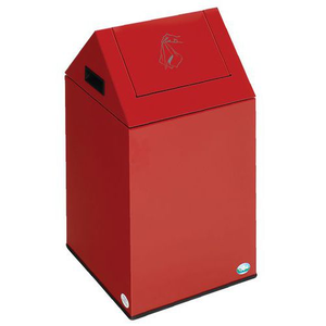 Rode afvalbak van staal met kantelklep. De klep is vlamdovend, is conform gecertificeerd. Verwijderbare kap met klep, verzonken handgrepen. Vergrendelring voor een betrouwbare bevestiging van de afvalzak. Epoxy-afwerking op gegalvaniseerd staal, corrosiebestendig. Let op: product getest door TÜV, is brandwerend.