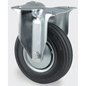 Bokwiel, vork van geperst staal, verzinkt, wielas met moer, plaatbevestiging. Wielkern van geperst staalplaat, met zwarte rubberband, wielnaaf op rollager, met afdekkappen