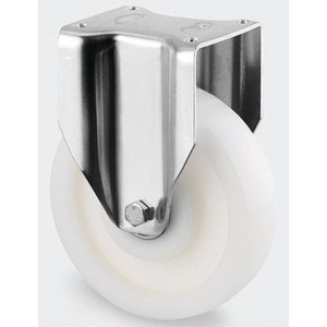 Bokwiel, vork van zwaar staalplaat, versterkt, wielas geschroefd, plaatbevestiging. Wielkern van polyamide, wielnaaf op precisiekogellager