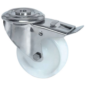 Geschikt voor gebruik in o.a. keukens en op roltafels Zwenkwiel met gaffel in roestvast plaatstaal, voor langdurig gebruik. Zwenkkop met dubbele kogellagers voor soepel zwenken. Met polyamide loopvlak voor gebruik bij temperaturen van -20 tot + 80 °C. Met vastgeschroefde as zodat het wiel eenvoudig vervangen kan worden. Gebruik de rem om zowel het rijden als het zwenken te blokkeren.