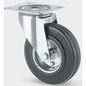 • Zwenkwiel, vork van geperst staal, verzinkt, dubbele kogeldraaikrans in de zwenkkop, wielas geschroefd, plaatbevestiging