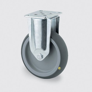 Bokwiel, Vork van geperst staalplaat, verzinkt-chromatiseerd, wielas geschroefd, plaatbevestiging. Lange zijde van de plaat haaks op rijrichting. Wielkern van polypropyleen met grijze niet-strepende TENTEprene thermoplastische rubberband, wielnaaf op glijlager