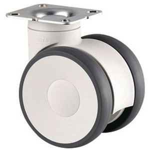 Zwenkwiel met plaat, Ø: 100 mm, Max. belasting: 100 kg, Wiel/Zwenkwielen kracht (Reeks): 1 - 100 kg, Wiel/Zwenkwielen diameter (Reeks): 1 - 100 mm, Breedte loopvlak: 20 mm, Boutgat Ø: 8.5 mm, Hartafstand bevestigingsgaten: 61,5/56 x 51,5/46,5, Totale hoogte: 124 mm, Totale breedte: 82 mm, Type naaf: Kogellager, Rem: nee, Gewicht: 0.804 kg, Type bevestiging: Met grondplaat, Loopvlak materiaal: Polyurethaan, Model: Zwenkwiel, Gebruik: Meubelindustrie, Breedte grondplaat: 67 mm, Lengte grondplaat: 77 mm, Kleur: Wit/grijs
