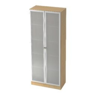 Hammerbacher kast SG 6100G. Met 2 glazen deuren. Materiaal: melamine. Afmetingen: 80 x 42 x 200,4 cm. Aantal planken: 4. Kleur: esdoorn, zilver.
