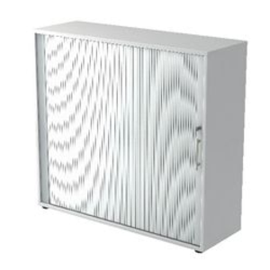 Hammerbacher roldeurkast 1733S. Afmetingen: 120 x 40 x 110 cm. Aantal planken: 3. Afsluitbaar: ja. Kleur: zilver, wit.