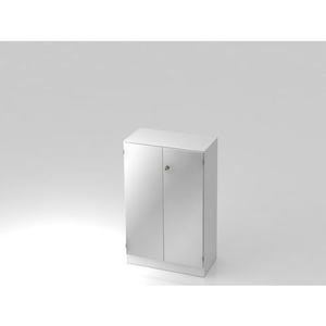 Draaideurkast stevig afsluitbaar met sokkel, Totale hoogte: 1270 mm, Totale breedte: 420 mm, Deur openingstype: Klapdeur, Kleur ombouw: Wit, Materiaal: MFC hout, Front kleur: Zilver, Kleur deur: Zilver, Kleur topblad: Wit, Geleverd gemonteerd: nee, Montage: Zelfbouw, Onderstel dikte: 10 mm, Legbord kleur: Wit