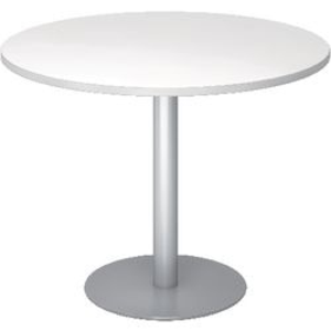 Hammerbacher pilaar tafel STF10. Materiaal: melamine. Stapelbaar: nee. In hoogte verstelbaar: nee. Type voet: pilaar. Zelfmontage: ja. Hoogte: 800 mm. Breedte: 800 mm. Kleur frame: zilver. Kleur: wit.