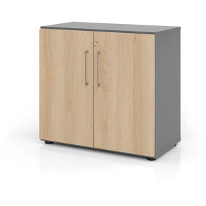 Draaideurkast met 2 legborden 4 poten, Totale hoogte: 746 mm, Totale breedte: 420 mm, Deur openingstype: Klapdeur, Kleur ombouw: Antraciet, Materiaal: MFC hout, Front kleur: Eiken, Kleur deur: Eiken, Kleur topblad: Antraciet, Geleverd gemonteerd: nee, Montage: Zelfbouw, Onderstel dikte: 10 mm, Legbord kleur: Antraciet