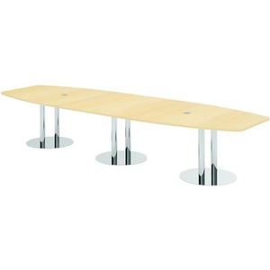 Vergadertafel ton met kolompoot, Type onderstel: 3 poten, Hoogte: 74 cm, Breedte: 4000 mm, Totale diepte: 1300 mm, Vorm: Tonvormig, Tafelblad materiaal: Gemelamineerd, Tafelblad kleur: Essen, Onderstel kleur: Grijs/zilver, Aantal laden: 0, Aantal aanpasbare laden: 0, Stapelbaar: nee