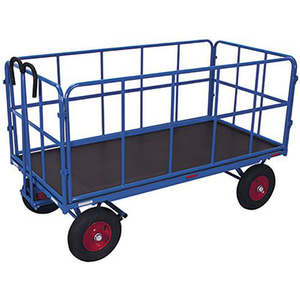 Handtrekwagen met 4 buiswanden, Max. belasting: 1000 kg, Wiel loopvlak: Pneumatisch, Nuttige breedte plateau: 1140 mm, Totale hoogte: 1340 mm, Plateau materiaal: Antislip multiplex, Diameter wiel: 100 mm, Max. dynamisch draagvermogen: 1000 kg, Geleverd gemonteerd: ja, Totale breedte: 1265 mm, Type naaf: Kogellager, CE: nee, Frame kleur: Blauw, Blad kleur: Zwart
