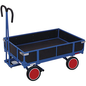 Handtrekwagen met wanden Uitvoering: * met automatische parkeerrem werkend op de voorwielen * incl. dissel met veiligheidshandgreep en automatisch gedempte terugschakeling in rustpositie * met 4 zijwanden, voorste kopse wand insteekbaar de ander 3 wanden uitklapbaar * laadvlak en zijwanden van multiplex, film-/zeefdrukcoating (zeef- drukoppervlak naar boven gericht), waterbestendig verlijmd Kleur: RAL 5010 gentiaan blauw, gepoedercoat