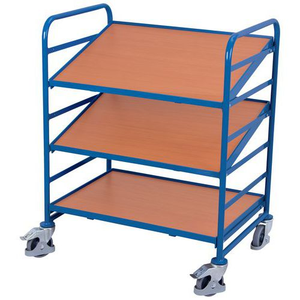 Plateauwagen voor Euronorm-bakken, Max. belasting: 200 kg, Totale hoogte: 1125 mm, Totale breedte: 665 mm, Totale lengte: 935 mm, Aantal plateaus: 3, Voor bak type: Euronorm-bak, Plateau materiaal: MDF, Nuttige lengte plateau: 825 mm, Nuttige breedte plateau: 610 mm, Geschikt voor Euronorm bakken: 600 x 400 mm, Zwenkwiel Ø: 125 mm, Gewicht: 52.50 kg, RAL: 5010, Onderstel materiaal: Staal, Montage: Zelfbouw, Lean Management: ja, Hoogte tussen 2 plateaus: 125 mm, Type wiel: 2 vaste wielen en 2 vaste wielen met rem