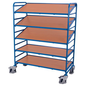 Plateauwagen voor Euronorm-bakken, Max. belasting: 250 kg, Totale hoogte: 1700 mm, Totale breedte: 665 mm, Totale lengte: 1350 mm, Aantal plateaus: 5, Plateau materiaal: MDF, Nuttige lengte plateau: 1240 mm, Nuttige breedte plateau: 610 mm, Geschikt voor Euronorm bakken: 600 x 400 mm, Zwenkwiel Ø: 160 mm, Gewicht: 103 kg, RAL: 5010, Onderstel materiaal: Staal, Montage: Zelfbouw, Lean Management: ja, Hoogte tussen 2 plateaus: 295 mm, Type wiel: 2 vaste wielen en 2 vaste wielen met rem