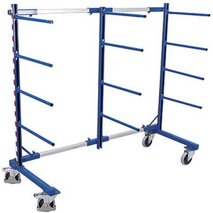 Draagarmwagen eenzijdig Buitenmaten: 840 - 3.200 x 800 mm (B/D) Totale hoogte: 1.800 mm Uitvoering: * uit gelaste staalbuis * breedte traploos instelbaar * 3 stijlen met elk 4 draagarmen * eenzijdig 12 draagarmen, nuttige lengte 595 mm, draagvermogen per arm 20 kg * draagarmen traploos verstelbaar Kleur: RAL 5010 gentiaanblauw gepoedercoat Wielset: Bandage van thermoplastisch rubber op kunststof velg met precisie kogellager, grijs, streeploos, diameter 200 mm, 2 geremde- en 2 zwenkwielen waarvan een met richtingvaststeller, geremde wielen met voetbeschermer Draagvermogen: 400 kg