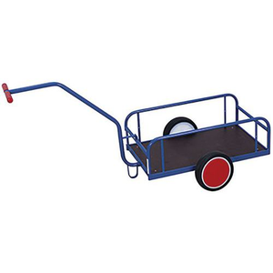 Handwagen zonder wanden Kopwandhoogte: 145 mm Hoogte lange zijde: 245 mm Uitvoering: * gelaste profielstaal frame van hoekstaal en vierkante buis * incl. 2 rode handvaten * incl. handdissel * laadvlak van multiplex, film-/zeefdrukcoating (zeefdrukoppervlak naar boven gericht), waterbestendig verlijmd Kleur: RAL 5010 gentiaan blauw, gepoedercoat Wielset: Elastische rubber bandage op stalen velg met precisie kogellager, zwart