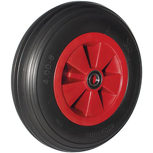 Lekvrije wiel 390 x 90 mm zwart rubber schuim wiel ZONDER VENTIEL op stalen velg, vuurrood met precisie kogellager lijnprofiel Eigenschappen als bij een luchtband Boring: 25 mm Naaflengte: 75 mm Draagvermogen: 150 kg