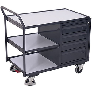 Werkplaatswagen ESD met 3 laadvlakken, Totale hoogte: 1010 mm, Aantal laden: 4, Totale breedte: 1125 mm, Totale diepte: 625 mm, Kleur: Grijs, Dikte tafelblad: 15 mm, Max. belasting per lade: 25 kg, Max. belasting: 250 kg, Aantal deuren: 0, RAL: 7024, Geleverd gemonteerd: ja, Zwenkwiel Ø: 125 mm, Max. belasting per legbord: 30 kg, Special Covid-19: nee, Aantal legborden: 3, Aantal zwenkwielen: 4, Werkbank blad materiaal: Staal, Gewicht: 81.5 kg, Wiel loopvlak: Massief rubber, Type wiel: Thermoplastisch rubber