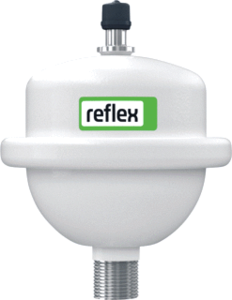 Reflex Refix waterslagdemper, diameter 86mm, hoogte 115mm, uitwendige buisdiameter 15mm, buitendraad conisch (NPT), inhoud 0.165L, max. mediumtemperatuur (continu) 70°C, max. werkdruk 10bar, nom. diameter 1/2" (15)