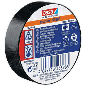 Isolatietape tesa 53988, Breedte: 15 mm, Lengte: 10 m, Kleur: Zwart, Klevende massa: Rubber, Totale dikte: 0.15 mm, Max. gebruikstemperatuur: 90 °C, Kleefkracht: 2,2N/cm, Diëlektrische doorslagspanning: 7000 V