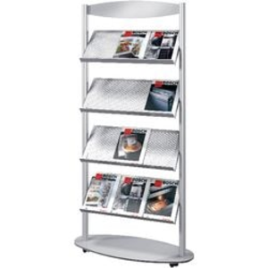 Kerkmann Folderhouder Sirius.12 x A4 borden. Aluminium zilver gepoedercoat staal, 4 verdiepingen van geperforeerde plaat met 40 mm hoge stop rand, ovale voetplaat, 4 afsluitbare dubbele wielen, met bescheidenheid cover-up, afmetingen: W780 x D340 x H1700 mm. Kleur: zilver