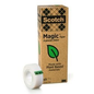 Scotch Magic tape A greener Choice. Plakband gemaakt van meer dan 53% natuurlijke grondstoffen. De lijm is op basis van plantaardige materialen en zonder oplosmiddelen. De kartonnen kern en de verpakking zijn gemaakt van 100% recycled karton. De rollen zijn niet individueel verpakt. De matte tape is overschrijfbaar en onzichtbaar bij kopieren. Afmetingen: 19 mm x 33 m. Hoeveelheid: 9 rollen.