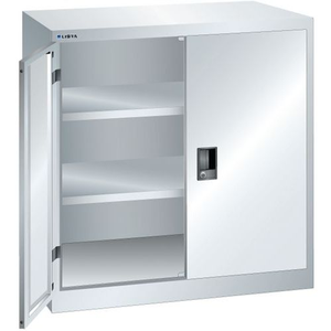 Draaideurkast (bxdxh) 1000x500x1000mm, Max. belasting: 60 kg, Totale hoogte: 1000 mm, Totale breedte: 1000 mm, Aantal legborden: 2, Totale diepte: 500 mm, Frame kleur: Grijs, Type: Draaideurkast, Type sluiting: Met sleutel, Max. belasting per legbord: 60 kg, Aantal laden: 0, RAL: 7035, Geleverd gemonteerd: ja, Gerecyclede verpakkingen: 50 %, Gerecycled product: 20 %
